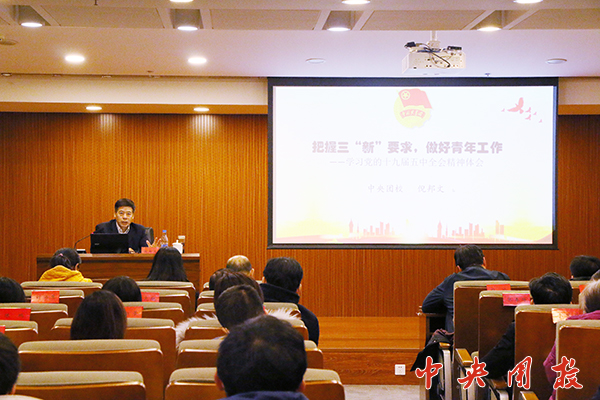 新闻中心讯(李鹏飞) 在全党全国深入学习宣传贯彻党的十九届五中全会精神之际,12月3日上午,校党委书记倪邦文以《把握三“新”要求,做好青年工作》为题,为师生宣讲党的十九届五中全会精神。