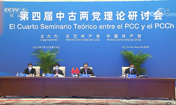 新闻中心讯 3月23日至24日,以“加强党的建设,奋进新时代中古社会主义新征程”为主题的第四届中古两党理论研讨会以视频方式举行。中共中央总书记、国家主席习近平向会议致贺信,古共中央第一书记、国家主席迪亚斯—卡内尔向会议致祝贺视频。中共中央政治局委员、中央书记处书记、中宣部部长黄坤明在3月23日开幕式上宣读习近平总书记贺信并致辞,古共中央政治局委员、中央书记处书记莫拉莱斯出席并致辞。