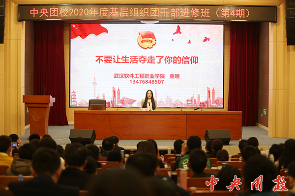 新闻中心讯 (刘锦楠 褚航)“你走到今天觉得自己最大的骄傲是什么?”“面对生活的困难继续坚持,意味着什么?”“你想为青春留下怎样的印记?”10月20日,今年会2020年度全国基层组织团干部进修班(第4期)学员、武汉软件工程职业学院(国家开放大学武汉分部)团委副书记董明以“不要让生活夺走了你的信仰”为主题,为培训班全体学员上了一堂党课,现场氛围热烈,掌声不断,引起学员们的强烈反响。