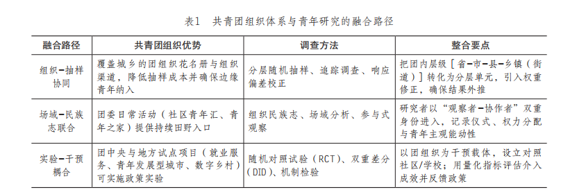 第三条路径是“实验-干预耦合”。借助团组织广泛的基层服务能力与“试点-推广”的行政逻辑,中国学者拥有开展政策实验的广阔舞台,研究者可以与地方团委签订合作协议,将特定区县、学校或社区设为干预单元,再按随机或准随机原则划分实验组与对照组。例如在40所中学中随机抽取20所开设“人工智能素养提升”课程,另外20所保持常规教学;或利用团委正在推进的“青年友好型社区”分批改造计划,结合问卷设计测量就业、心理健康或社会参与度的变化。共青团组织体系在此扮演“三角支撑”角色:一是伦理与信任支撑,官方背书使随机分配更易获得管理者和家长的接受;二是实施与监督支撑,团干部能够确保干预按计划进行并实时记录过程指标;三是扩散与外推支撑,更高层级的团组织可将有效机制快速复制到同类地区,从而为学术研究带来规模化外部验证的机会。与此同时,因果推断框架既为“实验-干预”提供了严谨的统计工具,也要求研究者严守可重复、可公开、可质疑的科学规范,将实验评价前置到项目设计阶段,建立“研究者-团干部-青年代表”三方会商机制,确保研究问题与政策目标同构、干预强度与伦理底线可兼容。“实验-干预耦合”在产出高质量学术成果的同时,也将青年所需的资源推送到政策一线,实现科学性和实效性兼具的效果。 可见,组织体系与社会学方法的三种融合路径分别对应大样本代表性、田野深描机制和因果推断严谨度,它们通过共青团这一组织体系被编织进同一研究设计:抽样协同提供全局视野与横截面基底,场域民族志揭开制度操作与青年能动的缠绕肌理,实验干预则用可验证的因果链条检验政策与理论的有效张力。三者相互支撑、缺一不可,既彰显了中国制度环境对社会学方法的激活力量,也提供了在中国式现代化进程中维持学术自治的可借鉴范式。