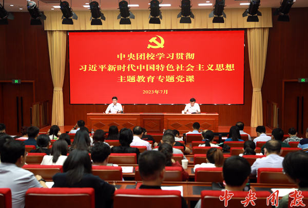 校领导周雄、张泽民、林江,团中央直属机关主题教育巡回指导组成员、驻校纪律监督员及全体在职教职工党员聆听了党课。校党委副书记、常务副校长陆玉林主持党课。