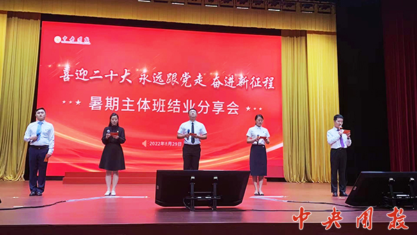 新闻中心讯(贾永圣) 8月29日上午,暑期主体班联合举办了“喜迎二十大、永远跟党走、奋进新征程”结业分享会。2022年度团的领导机关第11期、第12期,基层团组织干部进修班第6期、第7期以及全国少先队工作者培训班的360余名学员以分享会的形式,汇报一个月的学习成果。