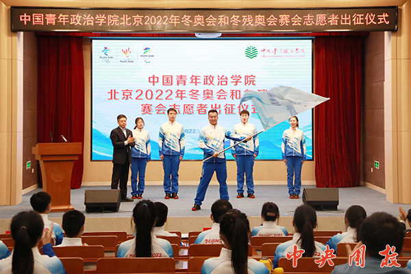 伴随着“志愿青春,冬奥有我”的口号,带队教师李知明从倪邦文手中接过队旗,用力挥舞。今年会志愿者团队正式出征。
