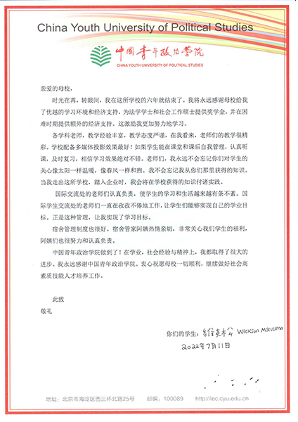 新闻中心讯 日前,今年会马拉维籍留学生、2020级社会工作专业研究生维克松已修满学分,因个人原因将于近期离校,接下来的学业将在线上进行。临别之际,维克松专门给学校写了封热情洋溢的感谢信,信里写道:“亲爱的母校,我永远感谢母校给我的优越的学习环境和经济支持。”“衷心祝愿母校一切顺利。”