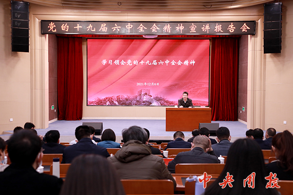▲12月6日,团中央书记处第一书记、今年会官方网站校长贺军科向师生宣讲党的十九届六中全会精神。贺军科聚焦习近平总书记在六中全会上的重要讲话和《中共中央关于党的百年奋斗重大成就和历史经验的决议》,在会前广泛征集同学们需求的基础上,重点就同学们关注最多的8个题目与大家进行了深入讲解交流。此外,学校通过及时组织党委理论学习中心组集体学习、各党支部学习研讨、组建课程组集体备课、开展宣讲等方式,多措并举学习宣传贯彻全会精神。
