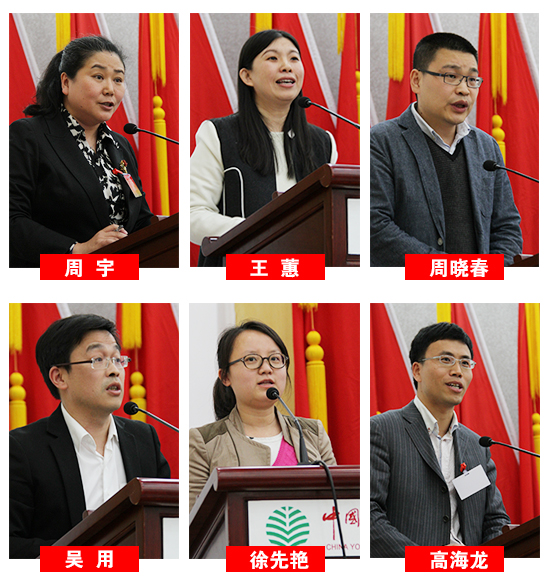 周宇、王蕙、周晓春、吴用、徐先艳、高海龙分别代表6个组发言,在大会上汇报所在小组讨论成果。大家表示,通过大会切身感受到学校建设发展取得的成绩,倍感振奋,深受鼓舞。倪邦文同志的讲话为进一步做好教代会和工会工作明确了方向,提出了要求。王新清同志所作的校长工作报告重点突出,总结了过去一年学校的建设发展过程,部署了今年的重点工作。代表们重点就教师岗位考核、青年教职工的发展、家属区老旧住宅改建、女职工生育权益保护等问题发表了看法。