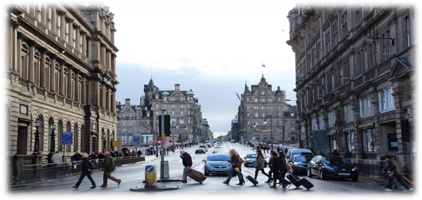 爱丁堡最有名的一条街是Royal Mile,尽头是爱丁堡城堡,另一头是荷里路德宫,女王夏天访问英格兰或者避暑都是住在这里面的。另一条有名的街是Prince Street王子街。王子街处于爱丁堡城中心,街上大多是购物的地方,爱丁堡Waverley火车站就在王子街街旁。