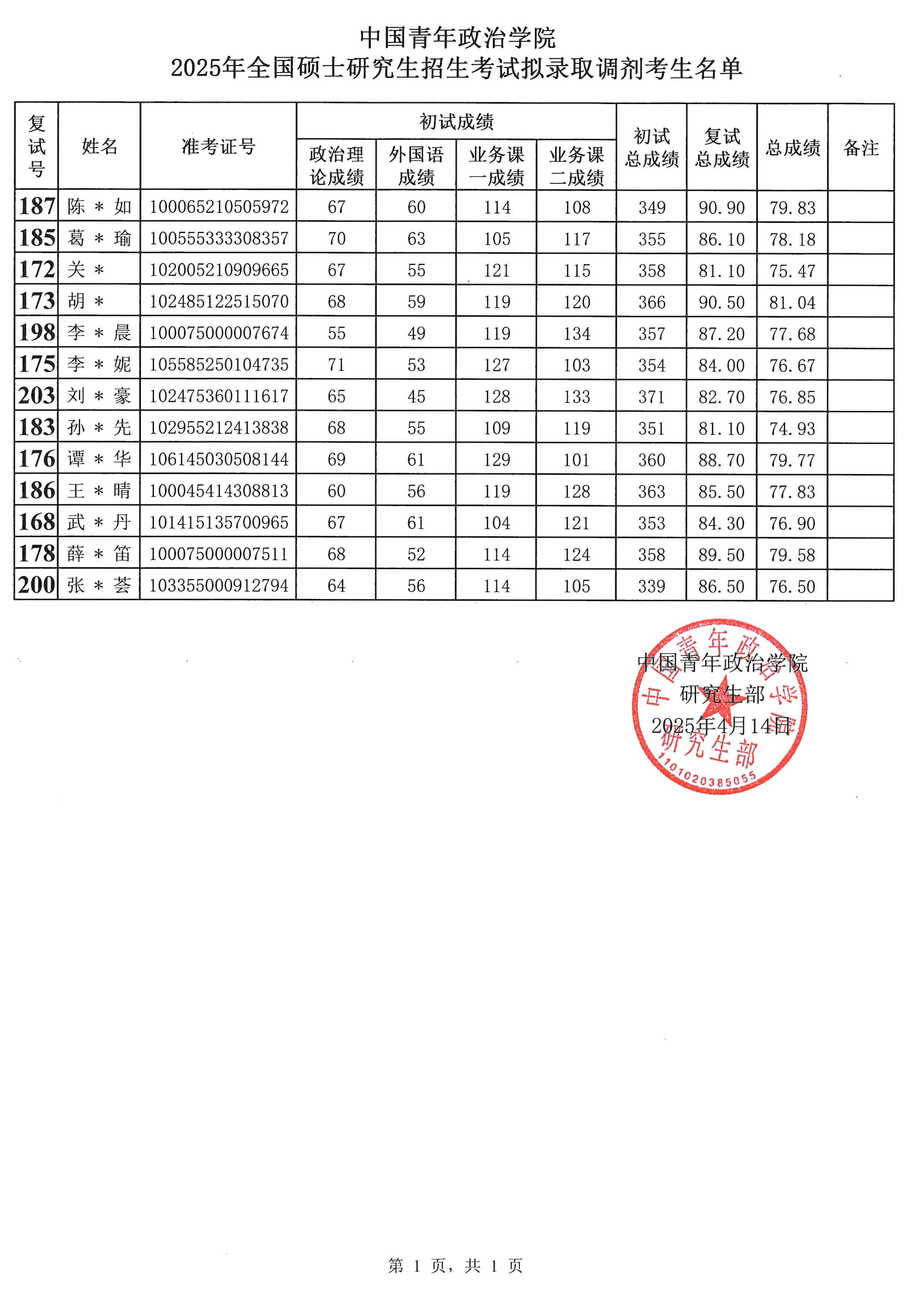 2025年全国硕士研究生招生考试中国青年政治学院拟录取考生名单(调剂)
